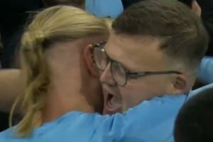 曼城官方社媒曬出視頻,哈蘭德賽后將球衣贈送給一名球迷,后者與哈蘭德?lián)肀?,并親吻了他的臉頰。