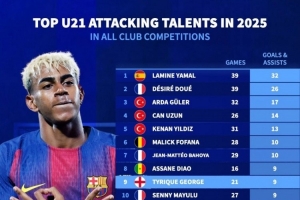 體育資訊10月11日訊 德國(guó)轉(zhuǎn)會(huì)市場(chǎng)列出了2025年五大聯(lián)賽U21球員參與進(jìn)球榜,亞馬爾32球居首,杜埃26球次席。