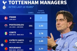體育資訊6月13日訊 熱刺官宣托馬斯-弗蘭克成為球隊(duì)新帥,德轉(zhuǎn)對(duì)熱刺近15年主帥的場(chǎng)均得分進(jìn)行了統(tǒng)計(jì),博阿斯1.91分最高,波斯特科格魯1.53分最低。