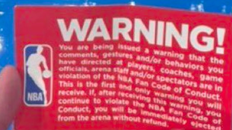 這張紙上的內(nèi)容為:“您對(duì)球員、教練、裁判、場(chǎng)館工作人員和/或觀眾發(fā)表的言論、做出的手勢(shì)和/或行為違反了NBA球迷行為準(zhǔn)則。這是您唯一一次收到警告。如果您在收到此警告后繼續(xù)違反NBA球迷行為準(zhǔn)則,您將被立即驅(qū)逐出場(chǎng)?!?/p>