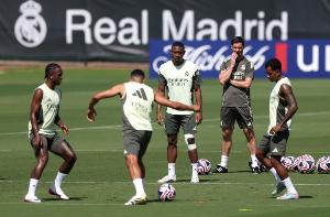 皇馬主帥阿隆索一直在向球員們傳達(dá)指示,在訓(xùn)練開始前和巴爾韋德進(jìn)行了交談,而在帶球訓(xùn)練中又專門指導(dǎo)了居勒爾。