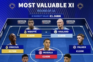 體育資訊6月28日訊 世俱杯小組賽全部結(jié)束,16強(qiáng)及其對(duì)陣出爐。Transfermarkt評(píng)選出16強(qiáng)身價(jià)最高的11人陣容,11人的市場(chǎng)總身價(jià)為13.6億歐元。