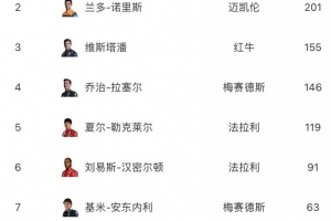 本站過后,皮亞斯特里216分領(lǐng)跑車手積分榜,諾里斯201分第二,維斯塔潘155分第三,拉塞爾、勒克萊爾、漢密爾頓分列4-6名。