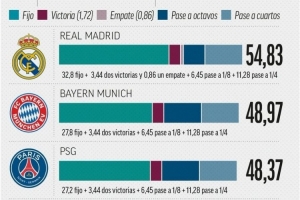 皇馬5483萬(wàn)歐元:參賽保底獎(jiǎng)金3280萬(wàn)、贏球獎(jiǎng)金344萬(wàn)、平局獎(jiǎng)金86萬(wàn)、晉級(jí)16強(qiáng)獎(jiǎng)金645萬(wàn)、晉級(jí)8強(qiáng)獎(jiǎng)金1128萬(wàn)