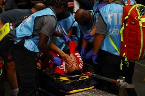 世俱杯1/4決賽,巴黎圣日耳曼vs拜仁慕尼黑,半場(chǎng)結(jié)束前,穆西亞拉與多納魯馬撞在一起,腳踝嚴(yán)重變形,隨后被擔(dān)架抬下場(chǎng)。