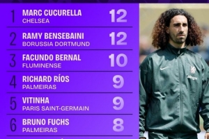 6、布魯諾-富克斯(帕爾梅拉斯)、古斯塔沃-戈麥斯(帕爾梅拉斯)、安東(多特蒙德)、巴爾韋德(皇馬)——8次