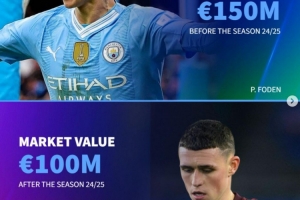 福登(曼城),現(xiàn)身價1億歐,賽季前1.5億歐,-5000萬歐