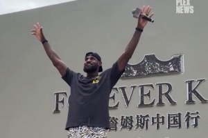 詹姆斯下午現(xiàn)身于成都萬象城出席活動,并來到外場冒雨與現(xiàn)場大量球迷熱情互動。