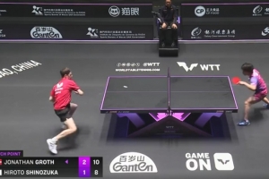 WTT中國澳門冠軍賽男單1/16決賽,格羅特3-1逆轉(zhuǎn)擊敗篠塚大登,四局比分為3-11、12-10、12-10、11-8。