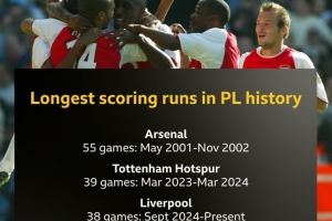 體育資訊9月15日訊 在本輪英超,利物浦1-0擊敗伯恩利,延續(xù)了球隊連續(xù)進(jìn)球場次紀(jì)錄。以下為英超歷史連場破門紀(jì)錄榜: