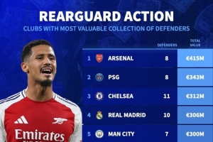 體育資訊9月24日訊 德國(guó)轉(zhuǎn)會(huì)市場(chǎng)統(tǒng)計(jì)了各隊(duì)陣容中后衛(wèi)球員的總身價(jià),并列出榜單,阿森納4.15億歐居首,巴黎、切爾西二三位。
