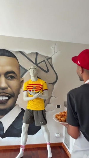 在視頻的最后,鏡頭賺到房間的一面墻,那里擺著一個亞馬爾標(biāo)志性慶祝動作的模型,亞馬爾的父親拿著雞塊說:“嘿,拉明,你還好嗎?我特別愛你,孩子,爸爸愛你。我給你準(zhǔn)備了驚喜,小可愛。等會兒給你戴上,咱就給大伙兒瞧瞧。我愛你?!?/p>