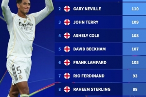 英格蘭球員歐冠出場(chǎng)次數(shù)榜:斯科爾斯124場(chǎng)居首,貝林50場(chǎng)第28