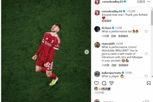 當(dāng)選隊內(nèi)最佳!布拉德利社媒:享受這場比賽,謝謝安菲爾德