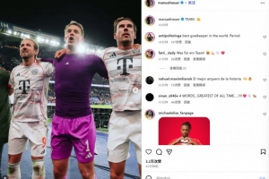 下半場(chǎng)少打一人,8次撲救守住勝利!諾伊爾社媒曬慶祝照:團(tuán)隊(duì)!